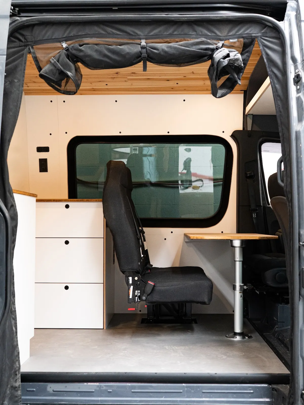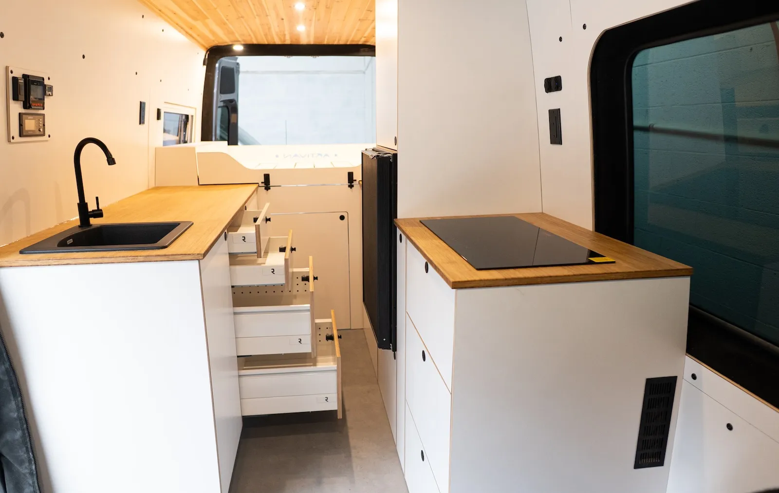 The layout also includes anchor points for future overhead cabinets, a convenient cockpit table for meals or remote work, and a removable double induction cooktop — ideal for cooking inside or outside the van.